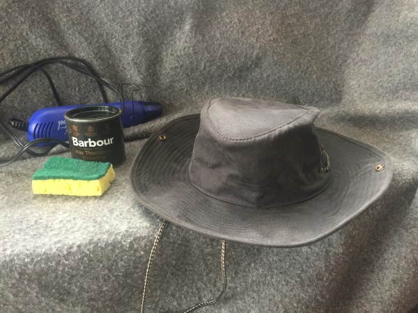 Using a craft sponge (a sponge with a handle on it) dip it in the Barbour wax, an apply liberally to your hat. While you are doing this, you will need to stop and use the heat gun on the hat. This will ensure the hat stays hot while applying the wax, and keep the wax from pooling on the hat. Use the craft sponge to scrub the wax into the cotton. This is important to ensure the wax penetrates into every fibre of the hat. You will know you are successful when you can see “wet spots” on the other side of the fabric