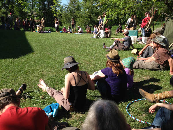 After the conclusion of the opening circle, everyone is free to do what they wish for the duration of the day. Many people participate in organised and impromptu educational sessions which cover everything from creating compost piles, proper use of axes and knives, carving wooden cups, making salves, to archery and splitting wood properly.