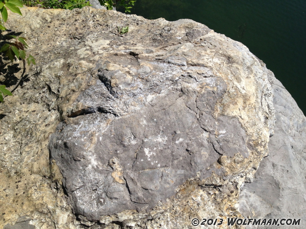Continuing along the edge of the quarry, there was a lot of great things to see. The ancient seabed had deposited thousands of large fossils in the rock, including tube worms, coral, and other things I could not identify. The fossilizing of the ancient coral had also created brilliant crystal forms inside the rock.