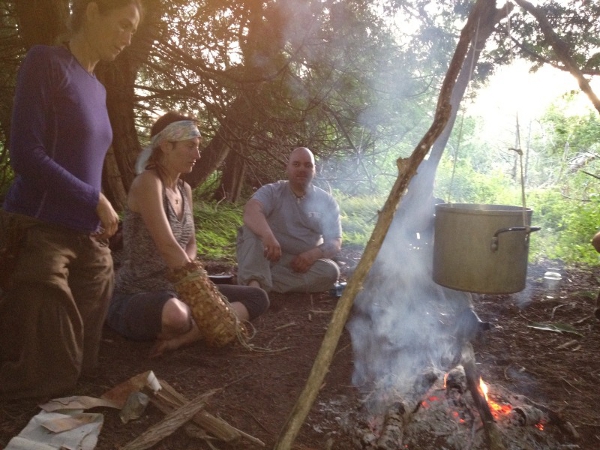 After a drum ceremony, our group played several games including “blind trail” where we took each other into the woods blindfolded and had each other identify plants and trees by smell and touch. It was a great way to spend an evening. Mutton soup arrived cold, and we created a tripod out of sticks to heat up our supper before bed. We made no shelter, and decided to sleep in our bags directly under the stars.
