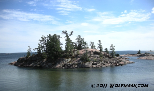 Heading out on the trail, I could feel the sun beating down on the exposed rock. The rock felt smooth, and very warm under my bare feet. Right past the trailhead sign, the beauty of Georgian Bay shows itself.