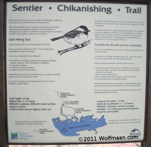 The Chikanishing Trail is a short 3.5km hiking loop which lay at the southernmost section of Killarney Provincial park in Ontario Canada. Although the trail is very short, almost every turn of the trail is steeped in history, and breath-taking views of Georgian Bay.
