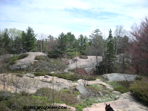 The trail leads back toward the parking lot, and back onto the massive, bare rocks.