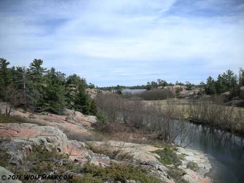 Following alongside the Chikanishing River, perched high atop massive rock faces, the trail slowly leads to Georgian Bay.