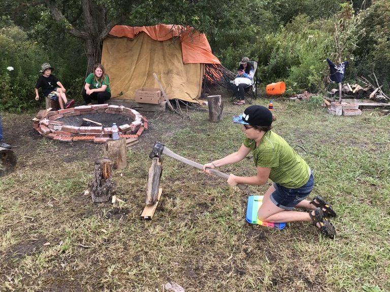 As part of the hands-on Knive / Axe and Fire workshop, Guides & Scout groups are taught the basics of axe safety including the safest way to split wood – kneeling down. This technique allows the use of any (or no) footwear, and keeps the body safe and clear of any potential strikes of the axe. Groups are also taught to how to read the wood for maximum splitting effectiveness.